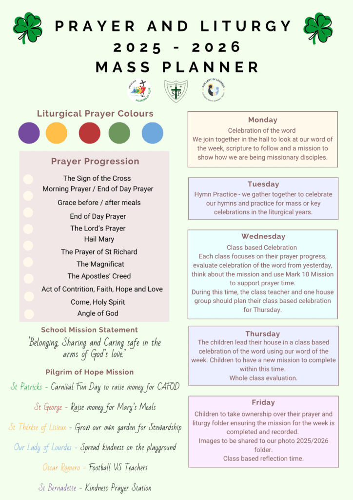 We follow the Word of the Week planner and use the format below to guide us through the week as a school, class and as a community. If a key feast day or liturgical event falls on one of these days, this will replace the timetabled worship below.